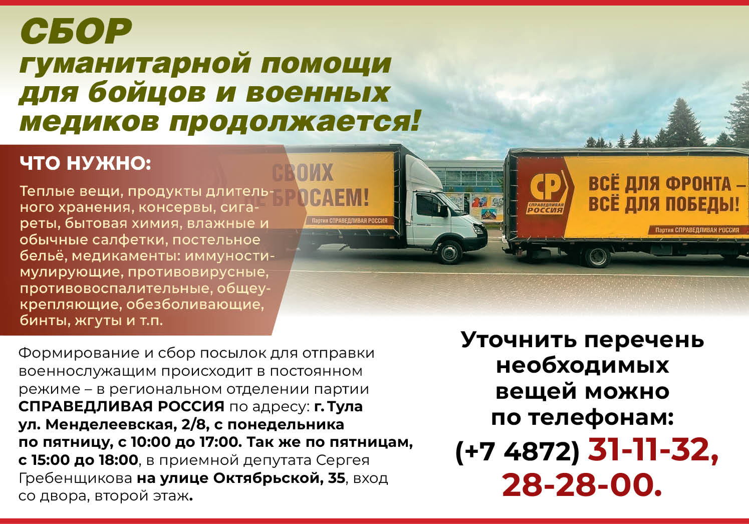 Знайте: ваша помощь – это общий вклад в приближение нашего победного окончания СВО. Тыл и фронт должны быть единым целым! Ребята, которые защищают Родину, отдают своё здоровье и жизни, должны чувствовать общую поддержку – всей страны, своих земляков. Для нашей команды СПРАВЕДЛИВОЙ РОССИИ, всех сторонников, помощь бойцам – дело чести!