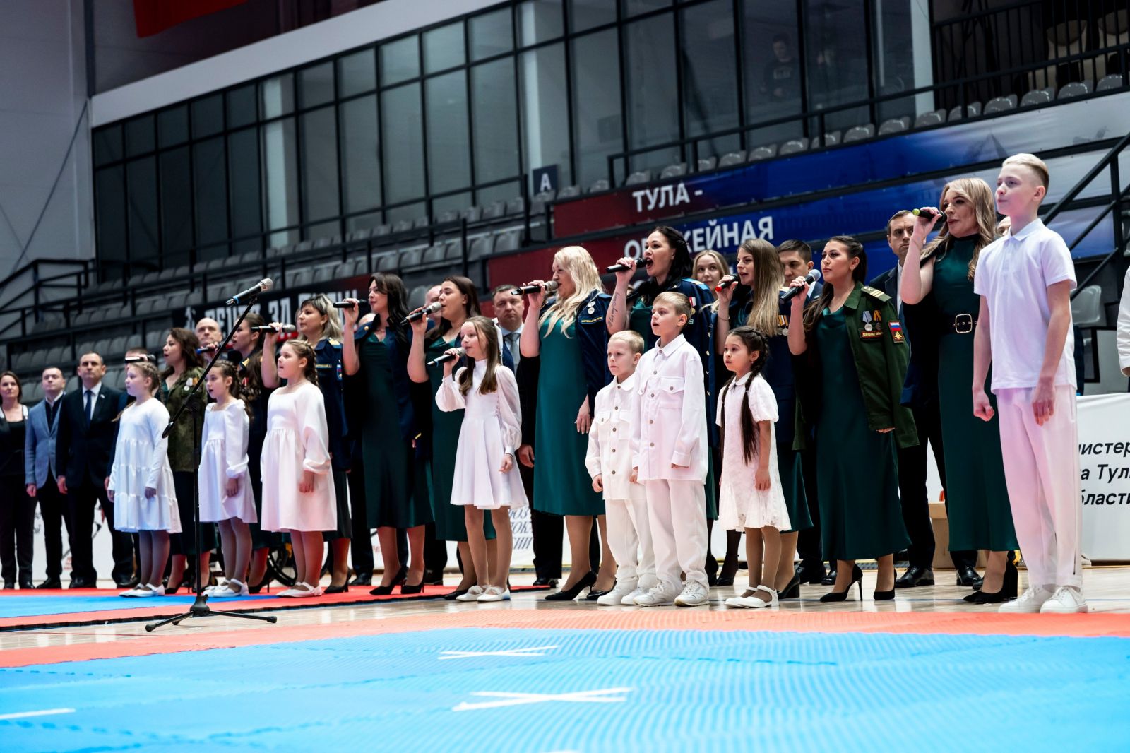Открытие соревнований началось с торжественного и очень трогательного исполнения гимна России в исполнении женщин и детей из объединения "Жены героев".