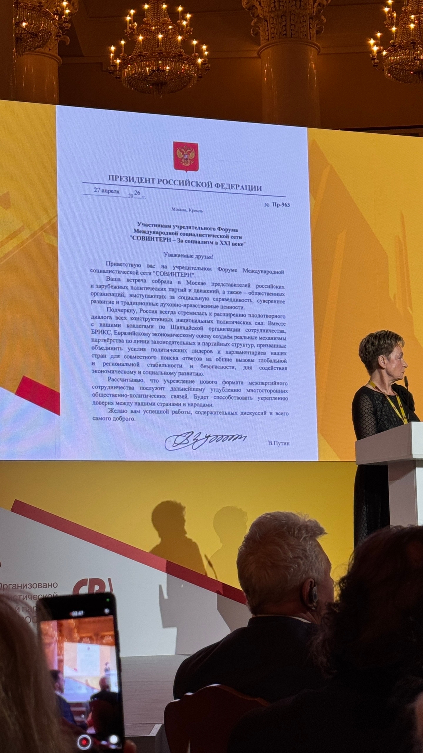 Приветственное слово участникам форума направил Президент России Владимир Путин. Глава государства пожелал собравшимся успешной работы и содержательных дискуссий, отметив, что Россия всегда стремилась к расширению плодотворного диалога всех конструктивных национальных политических сил.