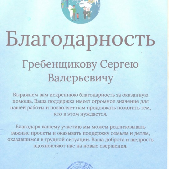Благодарность, которую представители Фонда на днях вручили Сергею Гребенщикову, – не просто выражение признательности, но и высокая оценка важности постоянного и системного содействия, реальной помощи в решении многих вопросов. В организации отметили, что благодаря участию депутата, удаётся реализовывать важные проекты, а личная доброта и щедрость Сергея Валерьевича вдохновляют окружающих на новые свершения.