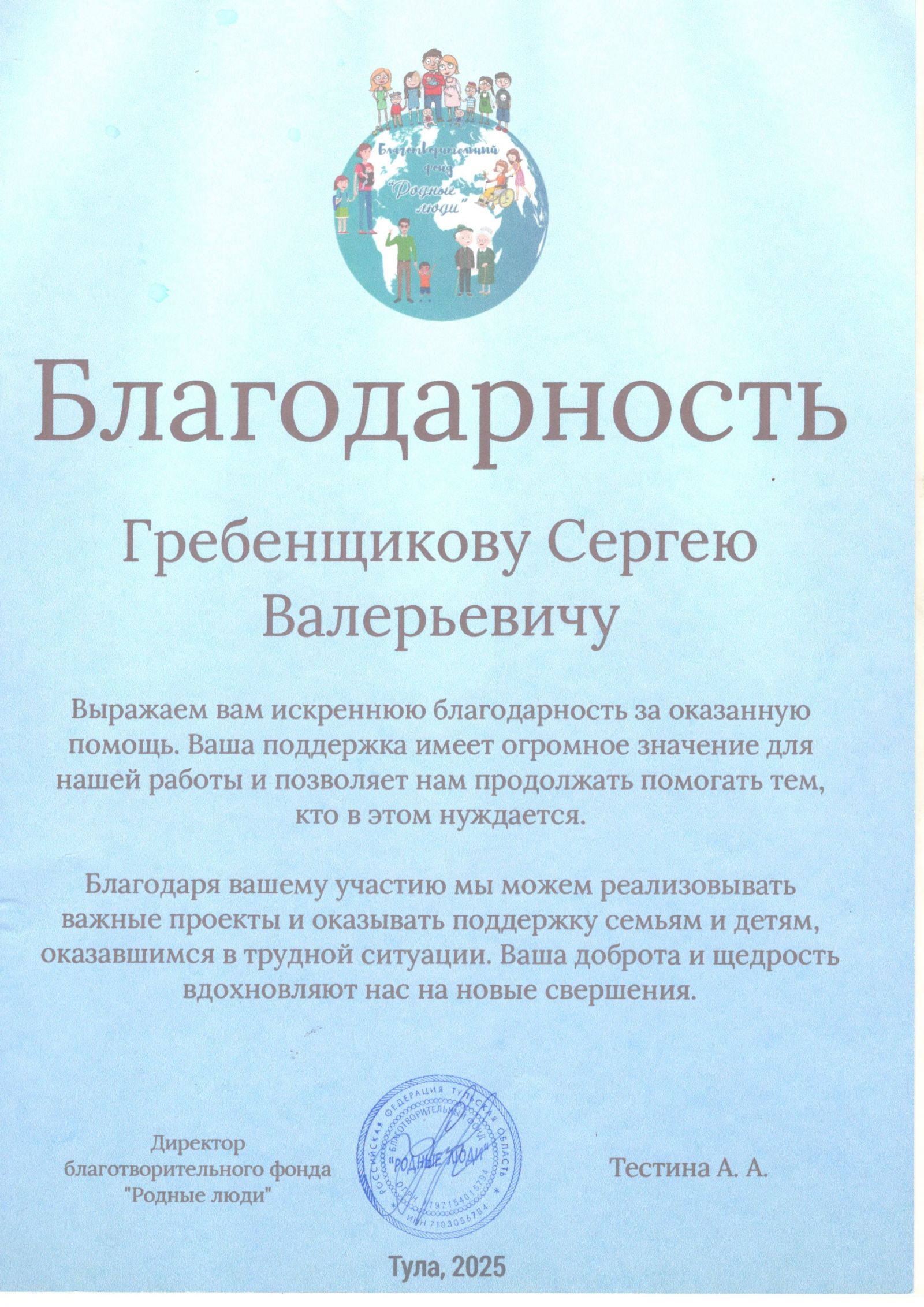 С тульским благотворительным фондом "Родные люди" руководитель регионального отделения СПРАВЕДЛИВОЙ РОССИИ, депутат областной Думы Сергей Гребенщиков активно сотрудничает много лет – практически с основания организации. Фонд оказывает помощь многодетным семьям, семьям, попавшим в трудную жизненную ситуацию и землякам, воспитывающим детей инвалидов. Лидер тульских однопартийцев постоянно оказывает поддержку подопечным Фонда, добрыми традициями стало вручение наборов школьных канцелярских принадлежностей к началу учебного года, сладких подарков к Новогодним праздникам, а также оказание помощи в организации различных мероприятий.