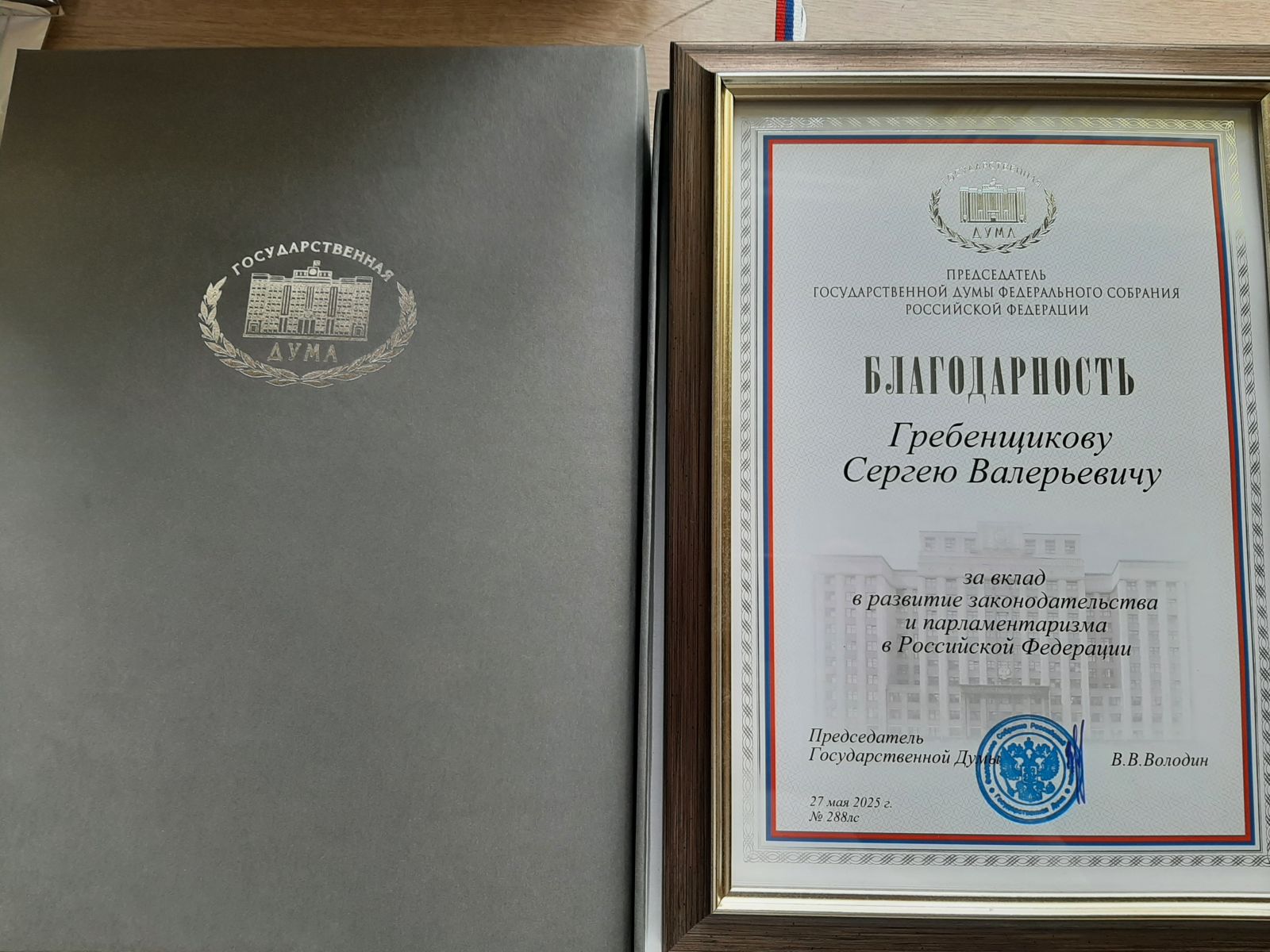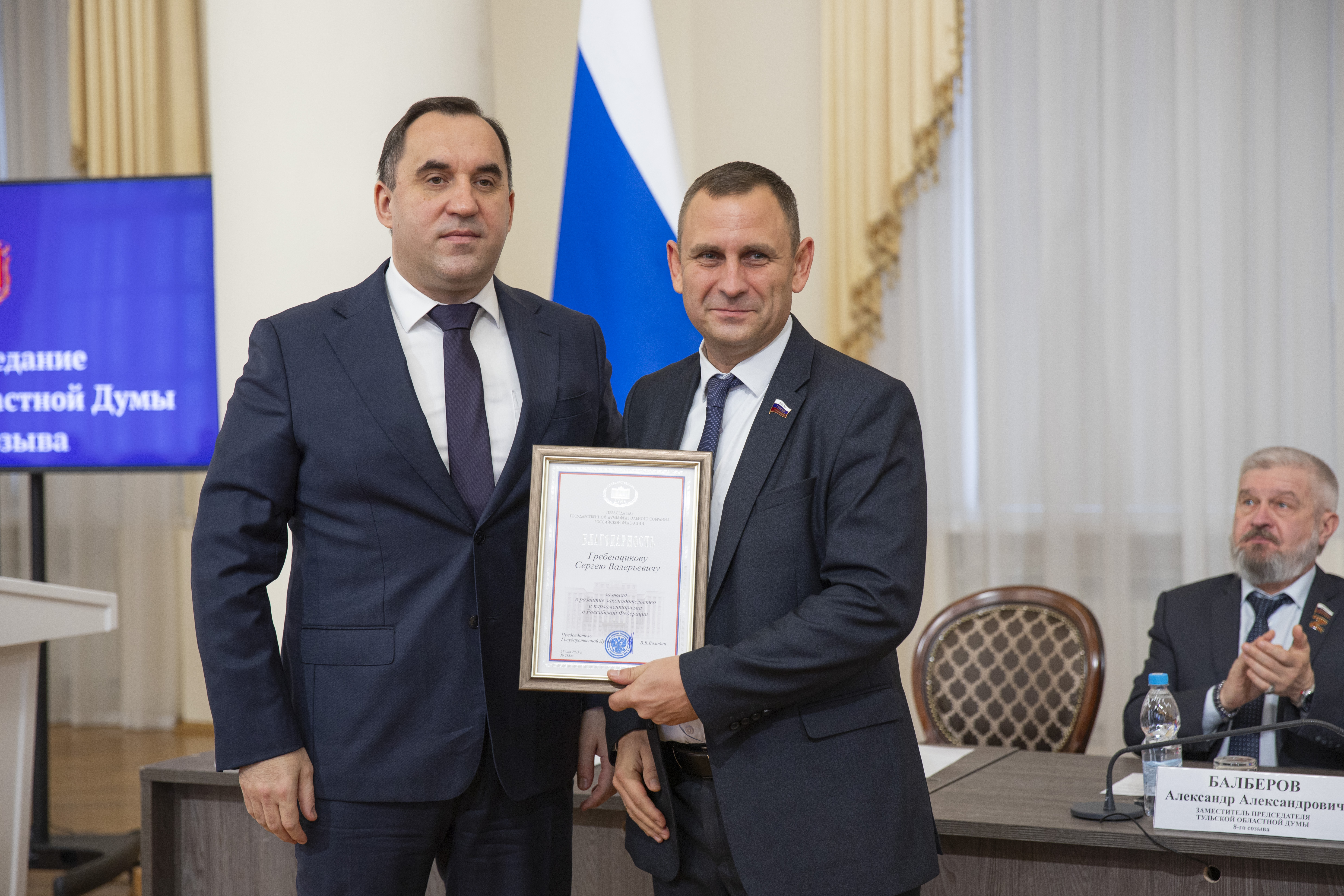 Руководитель регионального отделения партии СПРАВЕДЛИВАЯ РОССИЯ – ЗА ПРАВДУ, депутат Тульской областной Думы Сергей Гребенщиков награжден Благодарностью Председателя Государственной Думы России Вячеслава Володина за вклад в развитие законодательства и парламентаризма страны.