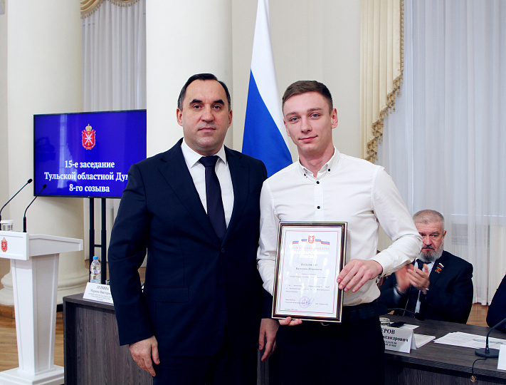 Наш молодой соратник, член регионального отделения СПРАВЕДЛИВОЙ РОССИИ Валерий Пахомов отмечен Благодарственным письмом Тульской областной Думы за добросовестный труд и достигнутые успехи в профессиональной деятельности. Награду вручил председатель регионального парламента Андрей Дубровский на 15-м заседании Тульской областной Думы.